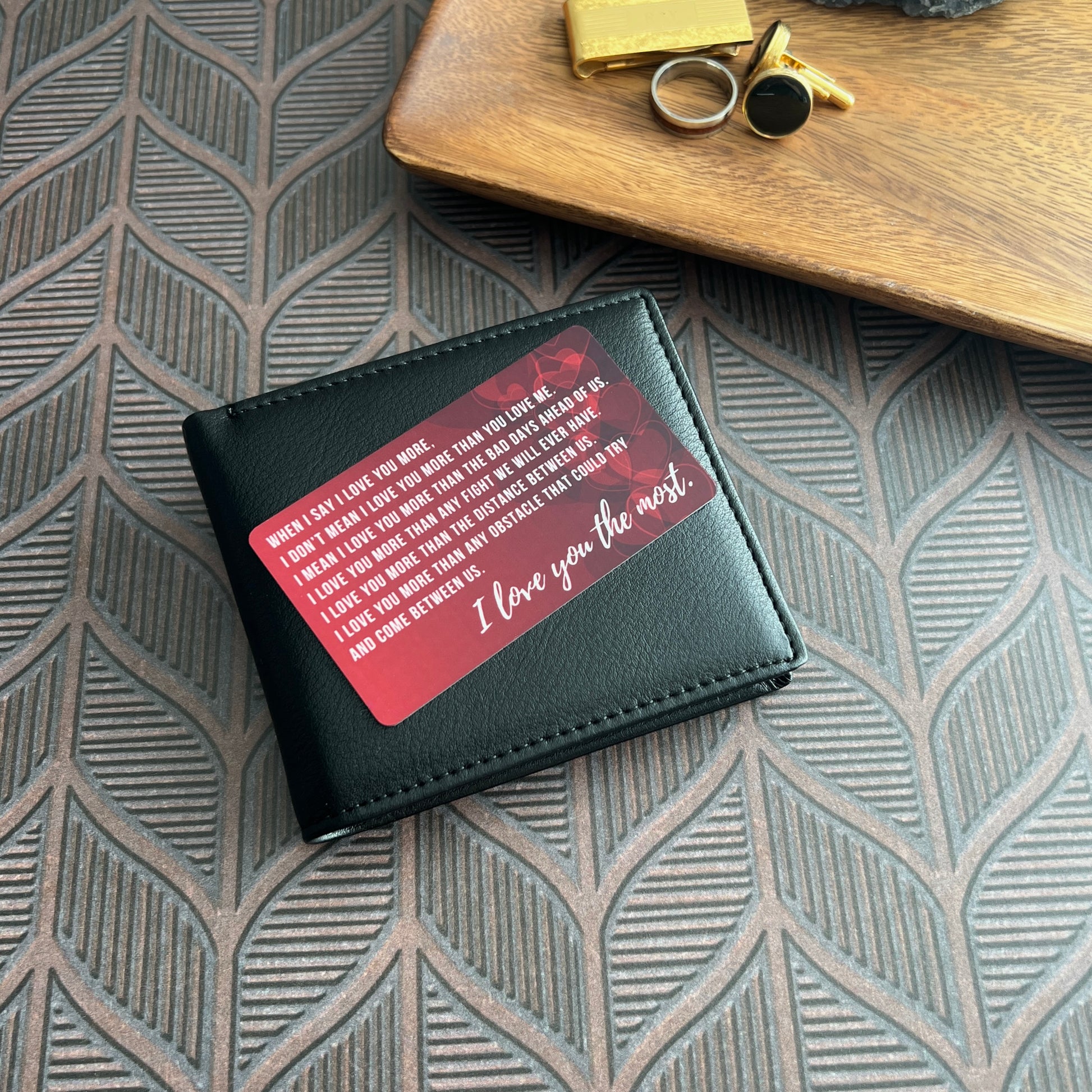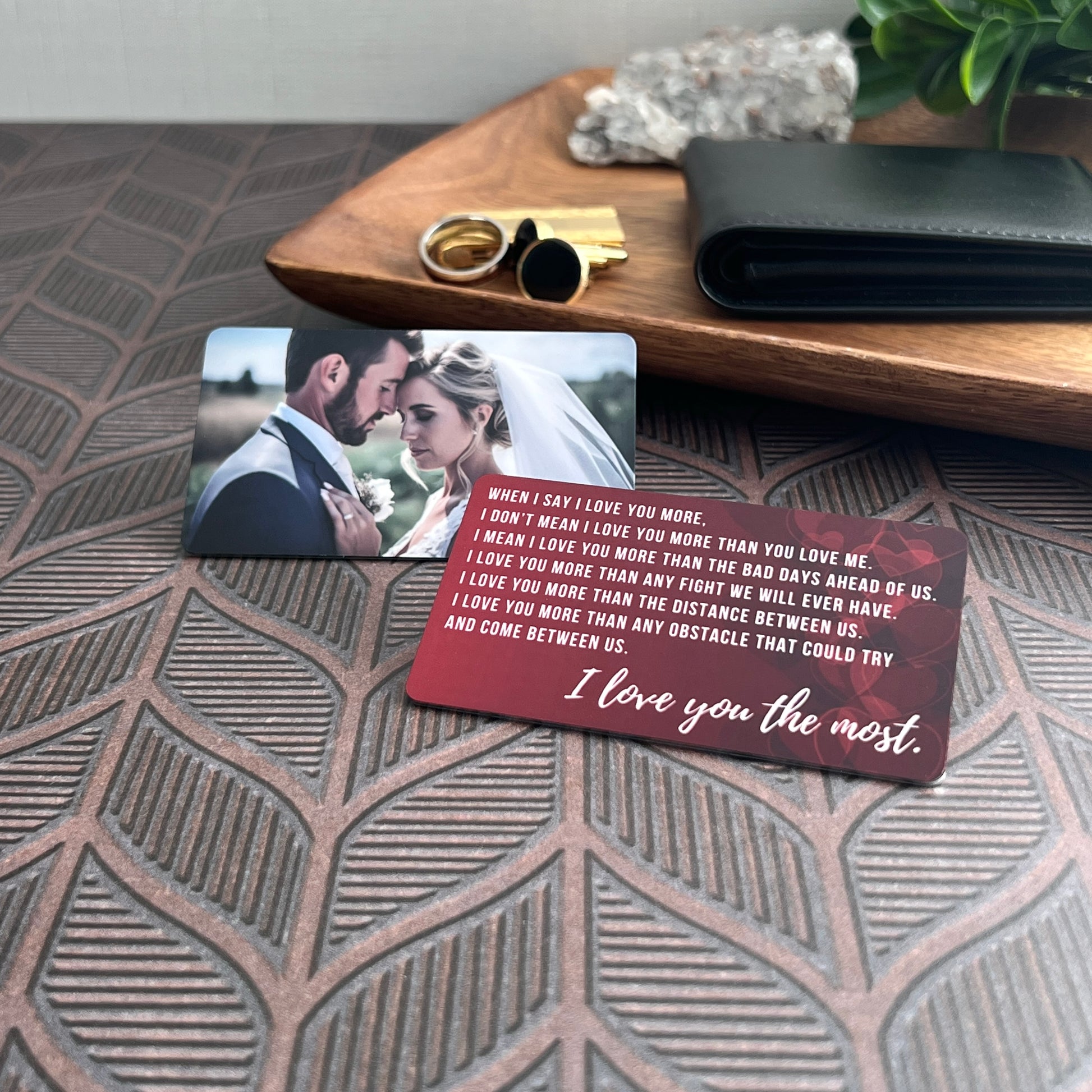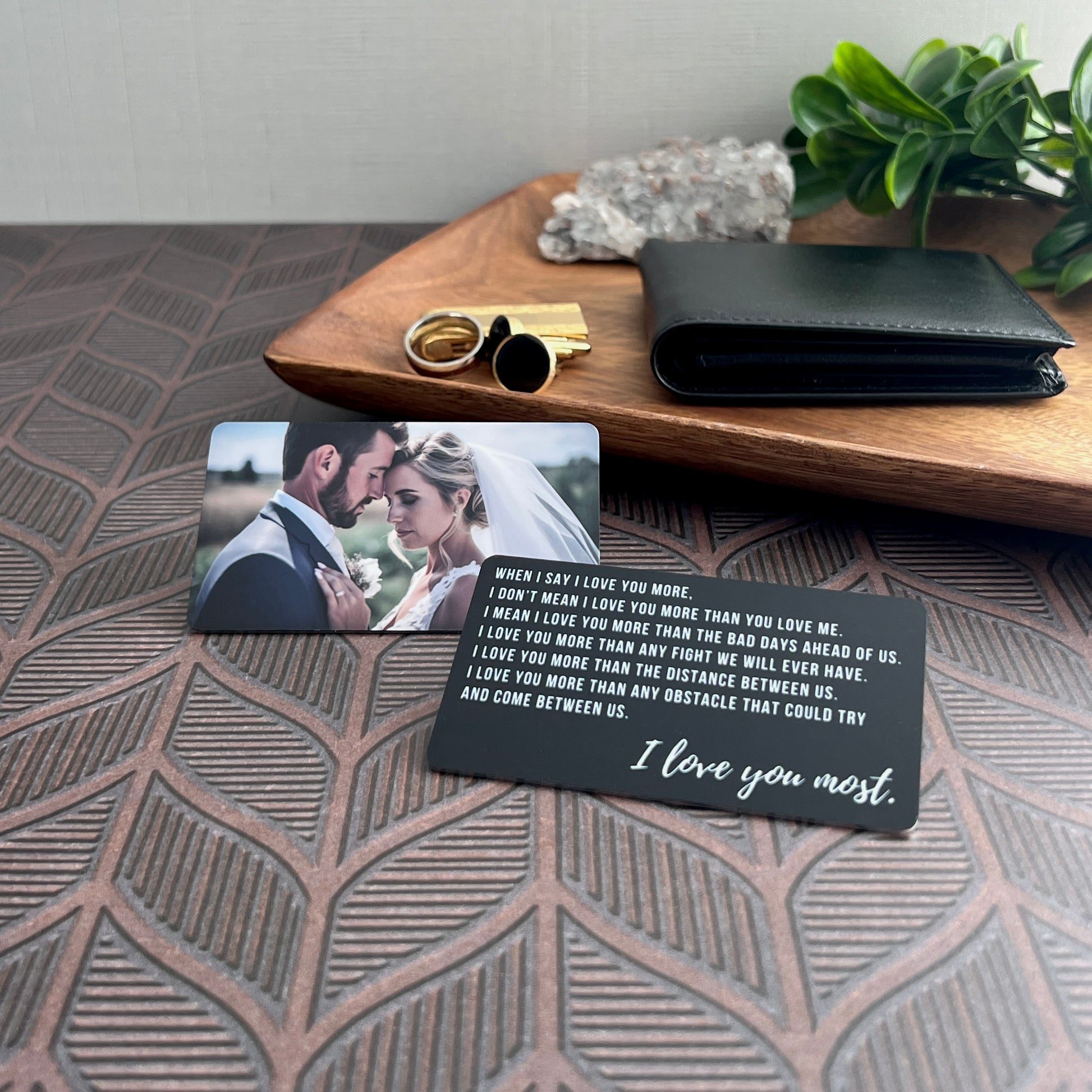 Turn a favorite moment into a treasured keepsake with this custom wallet insert. One side reads “I Love You Most” in elegant script, while the back showcases your photo in full color. Whether you’re celebrating an anniversary, Valentine’s Day, or just sending love from afar, this pocket-sized gift leaves a lasting impression.