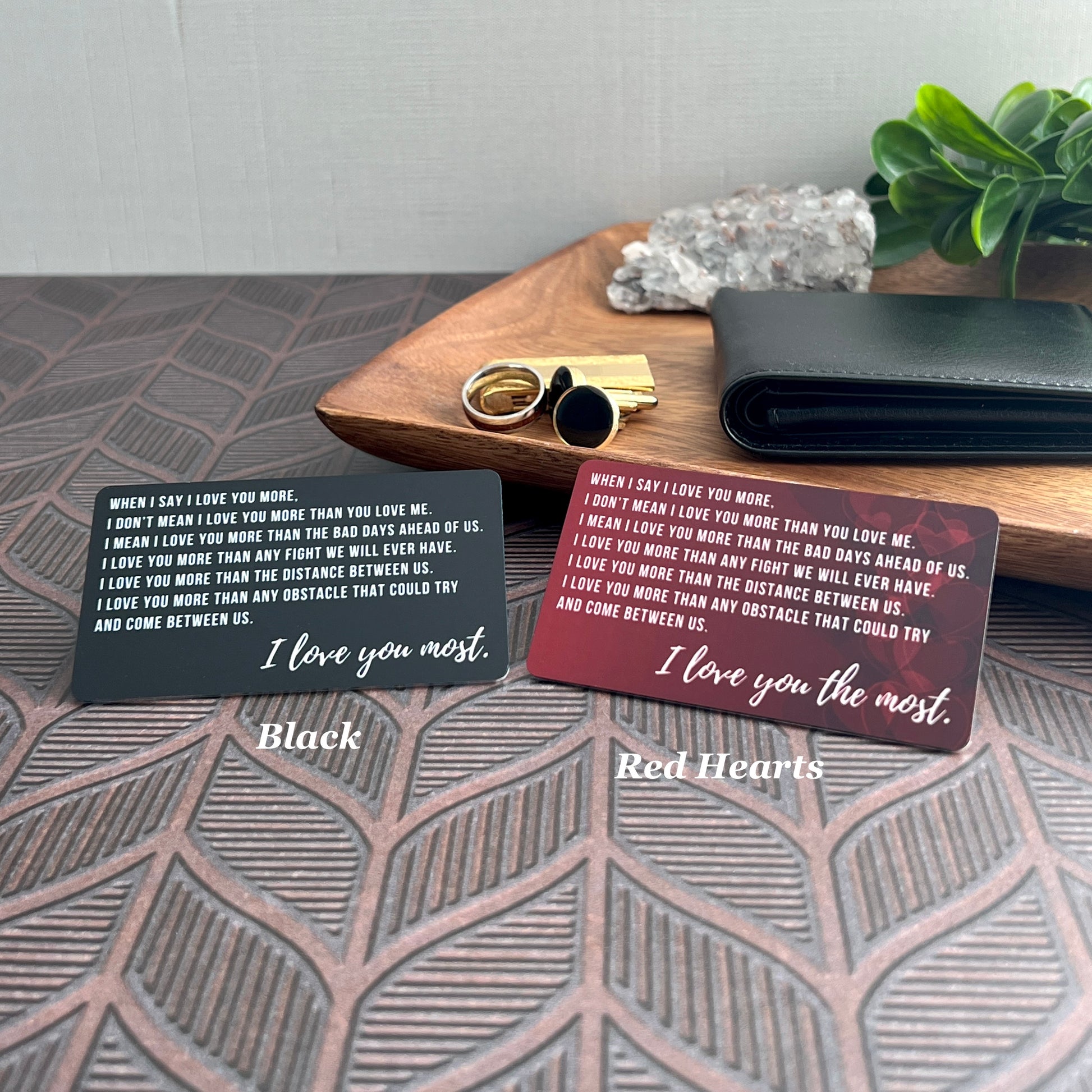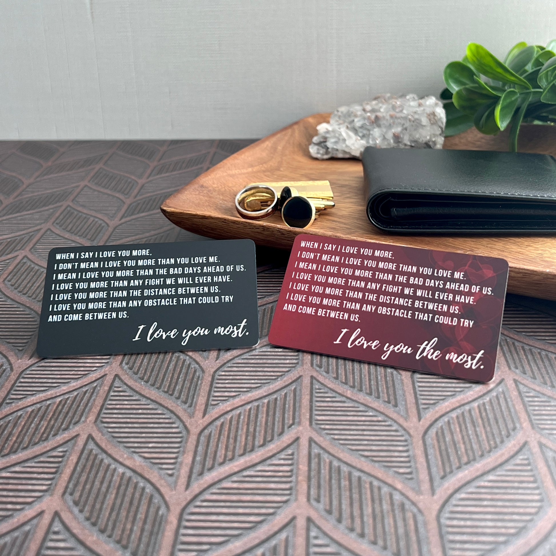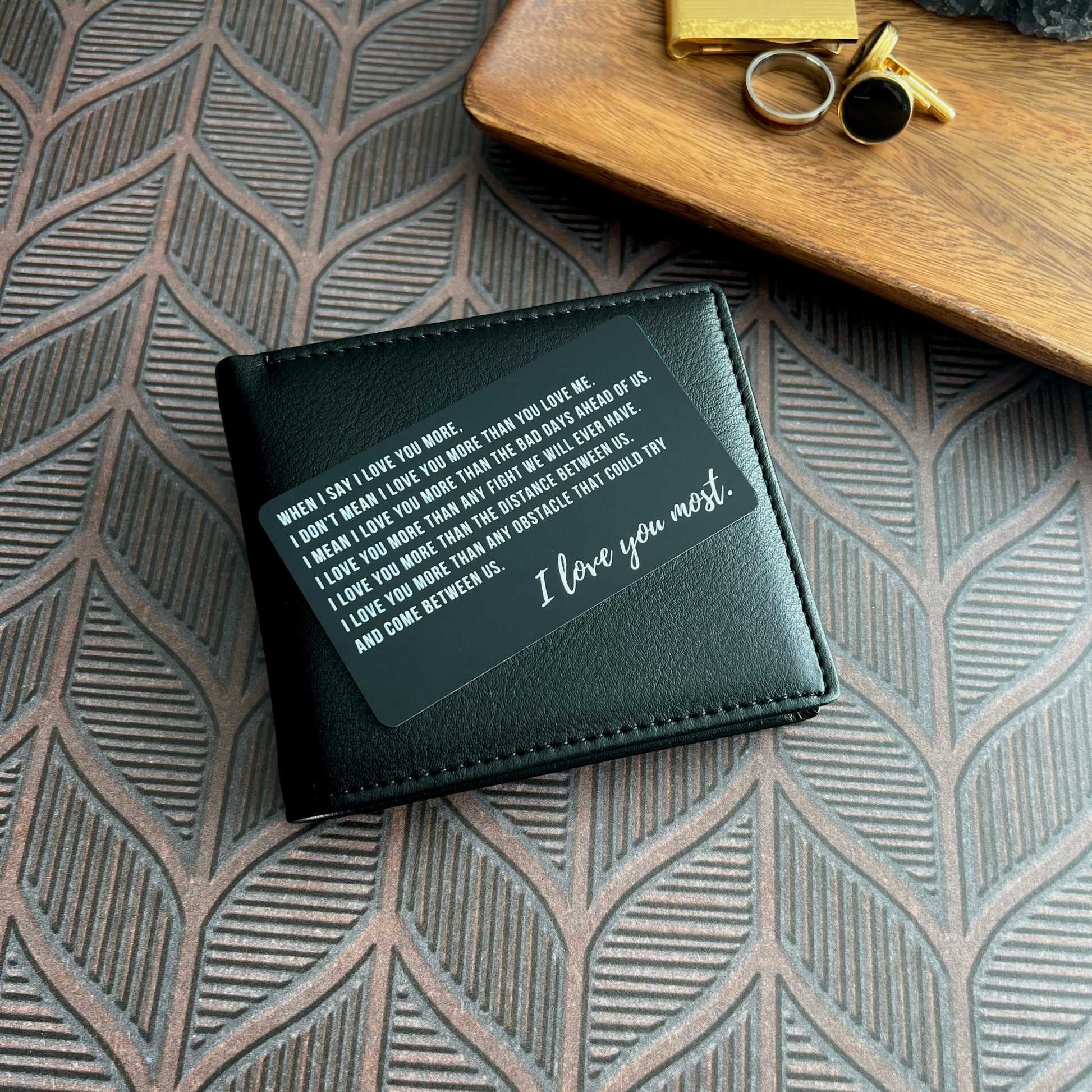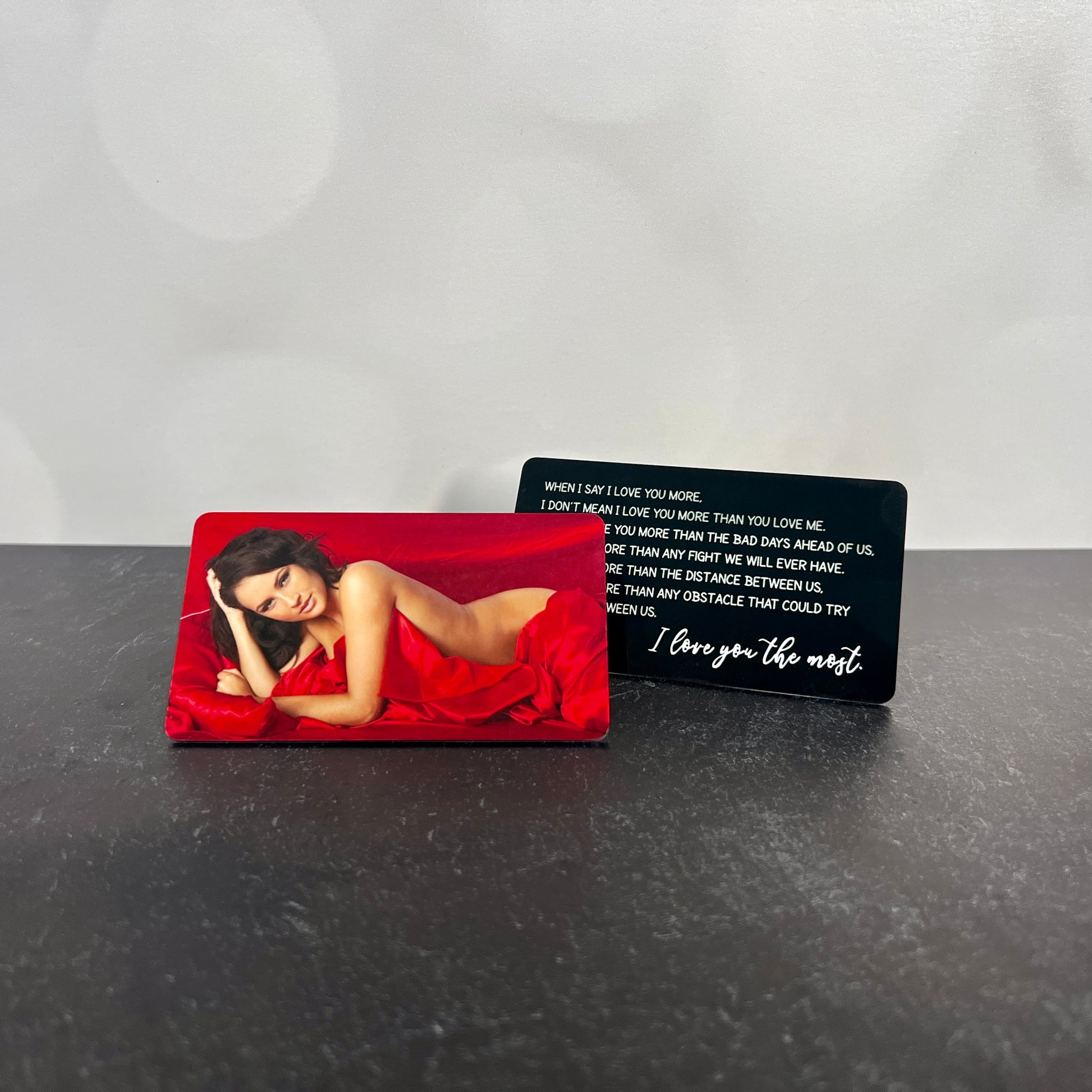 Turn a favorite moment into a treasured keepsake with this custom wallet insert. One side reads “I Love You Most” in elegant script, while the back showcases your photo in full color. Whether you’re celebrating an anniversary, Valentine’s Day, or just sending love from afar, this pocket-sized gift leaves a lasting impression.