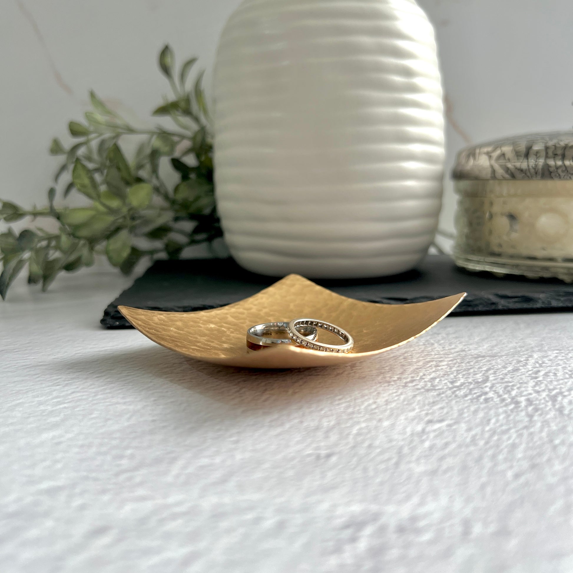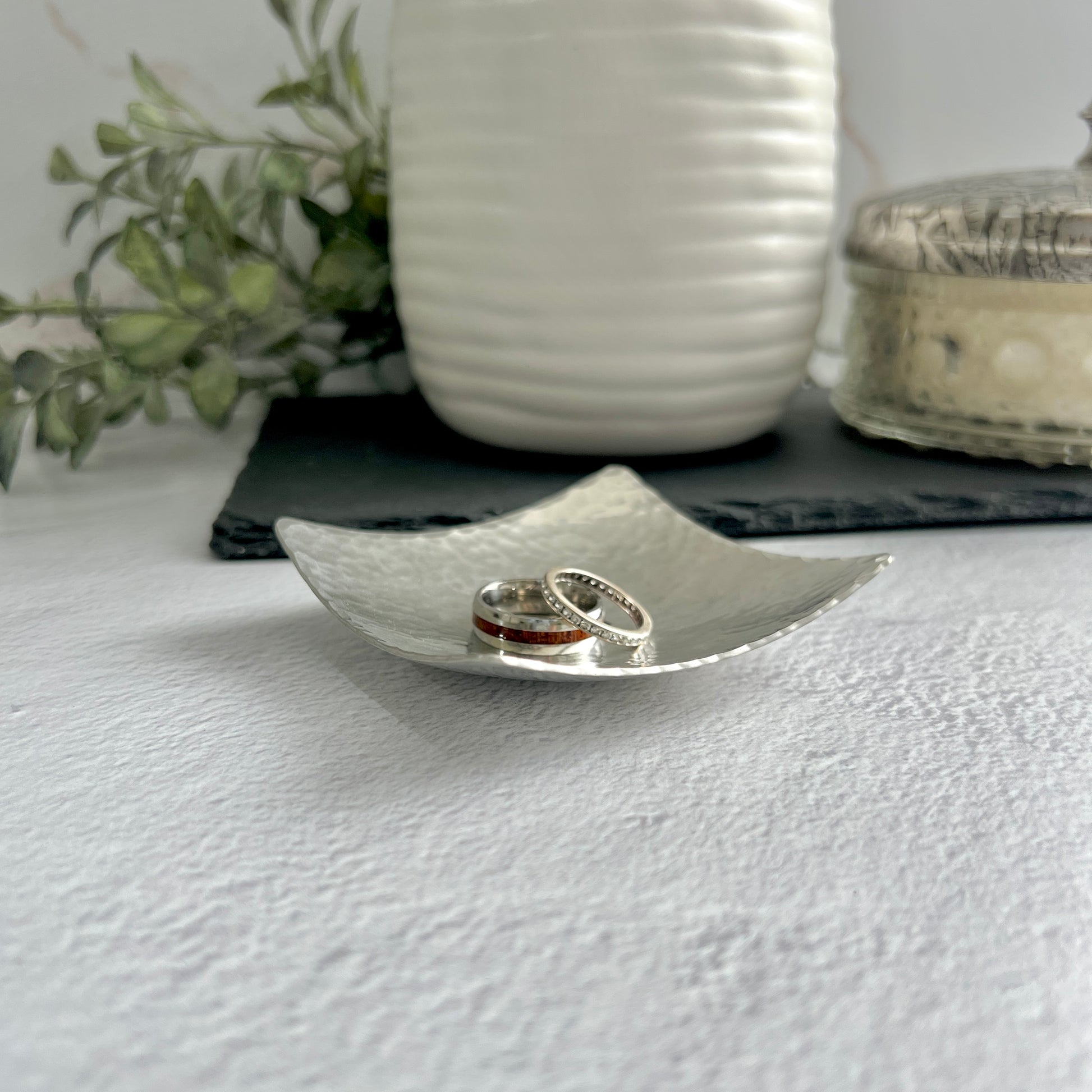 Our custom small square ring dishes are a thoughtful, handcrafted way to celebrate love, milestones, or everyday moments. Made from heavy-gauge copper, bronze, or pewter, each 3-inch dish is individually formed and textured by hand, then polished and coated with a clear wax.