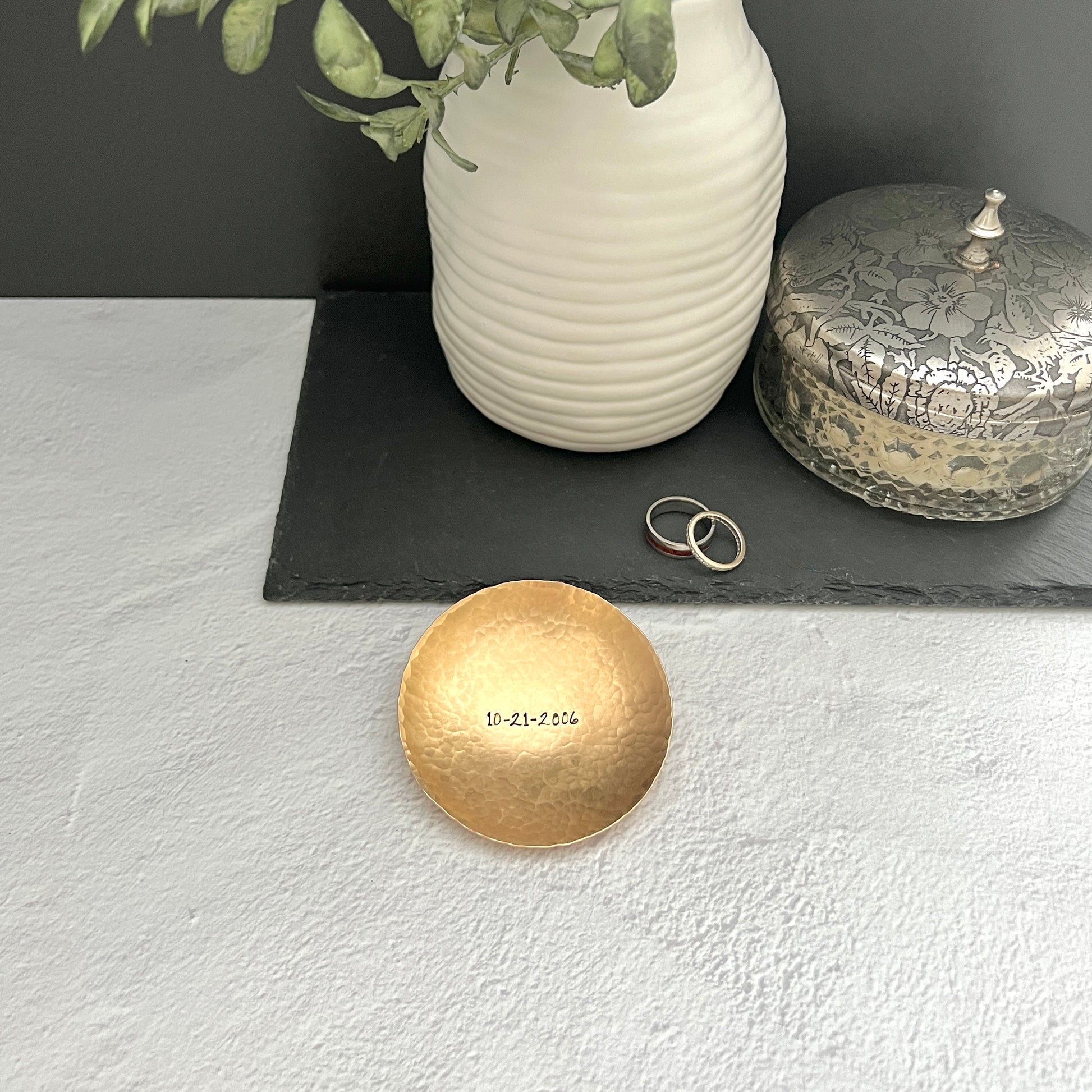 One of our most loved gifts, this bronze ring dish is handcrafted with your personalized message. Each piece is individually hammered and engraved with your custom message — names, initials, or dates — creating a timeless keepsake they’ll treasure.