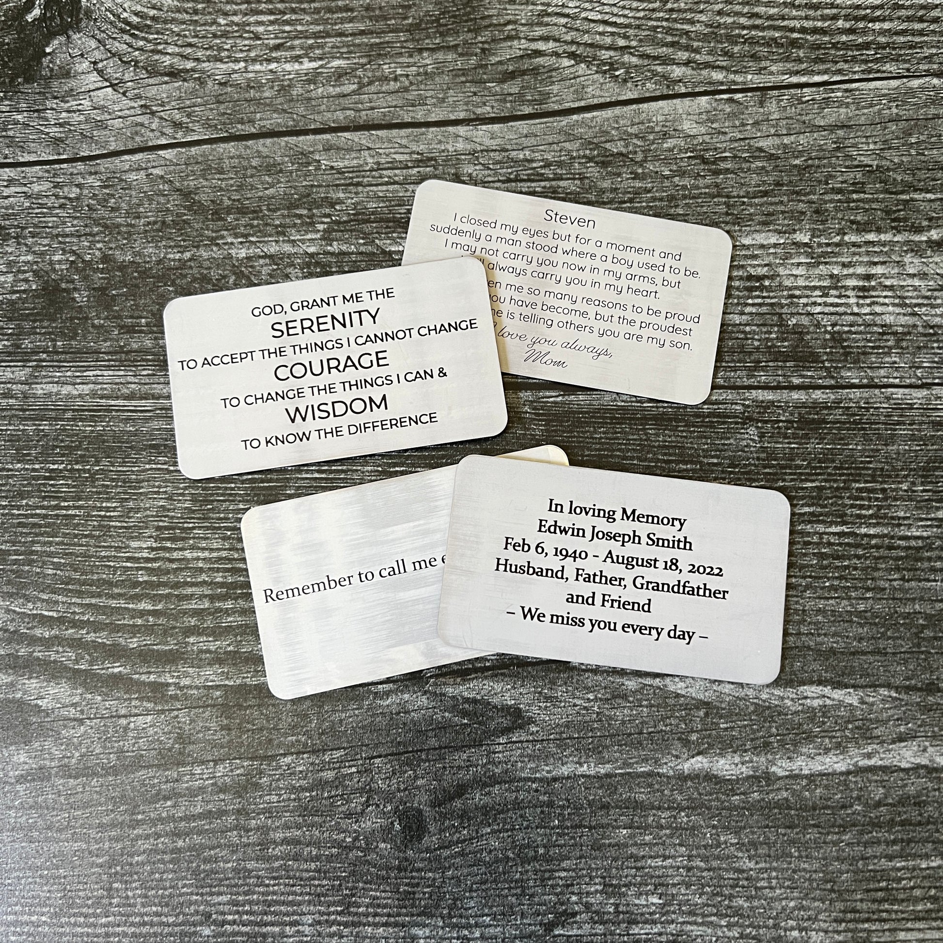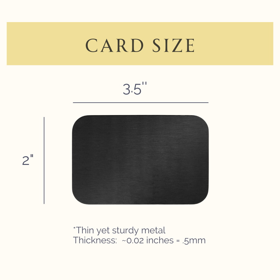 Wallet Card Details: 3.5" x 2", engraved on thick .050 in (1.27mm) metal.