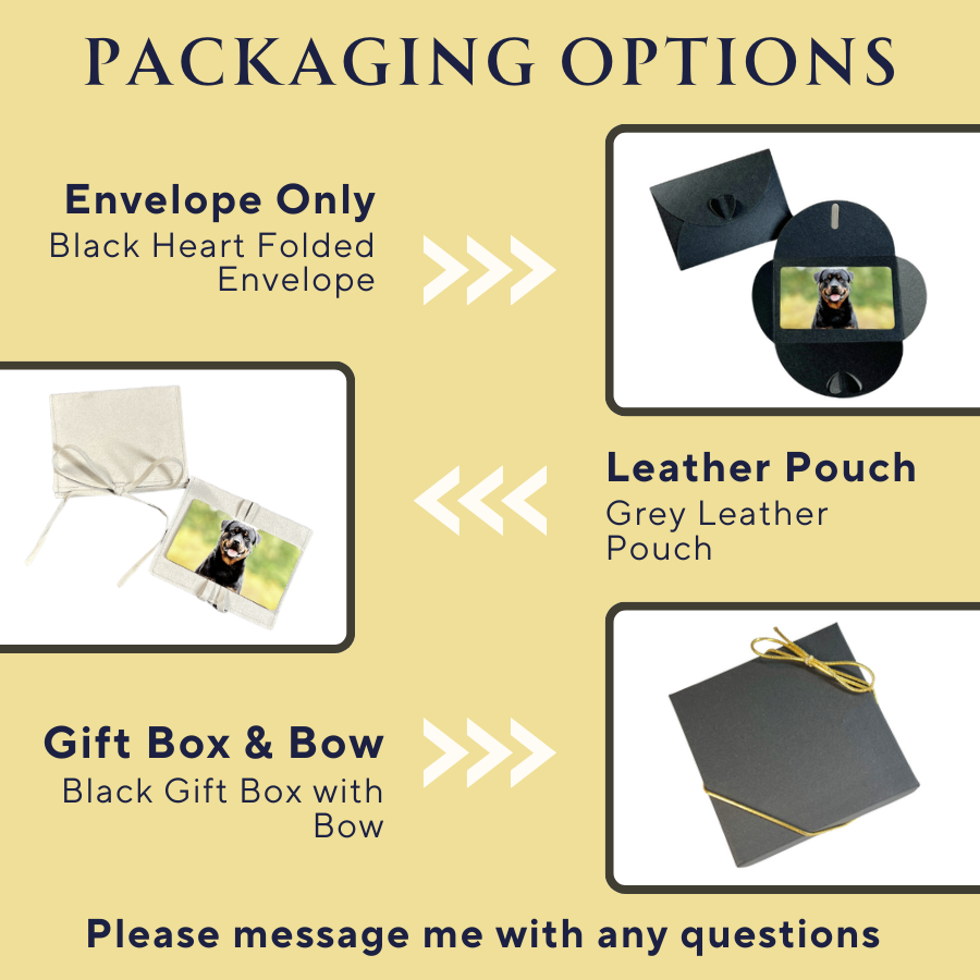 Honor the memory of your beloved pet with a beautiful photo wallet card, custom-designed to hold their image and your heartfelt words. Crafted from color-infused metal, this Polaroid-style tribute is made to fit any wallet, allowing you to carry a piece of their spirit wherever you go.
