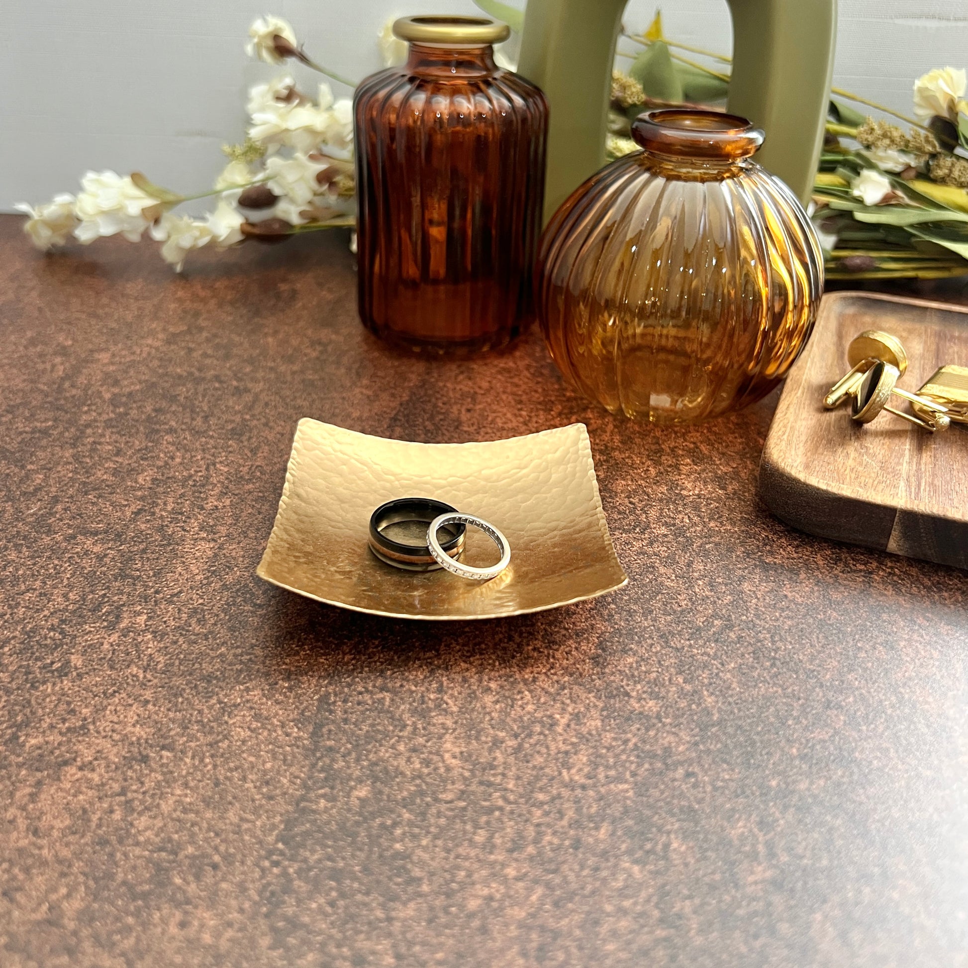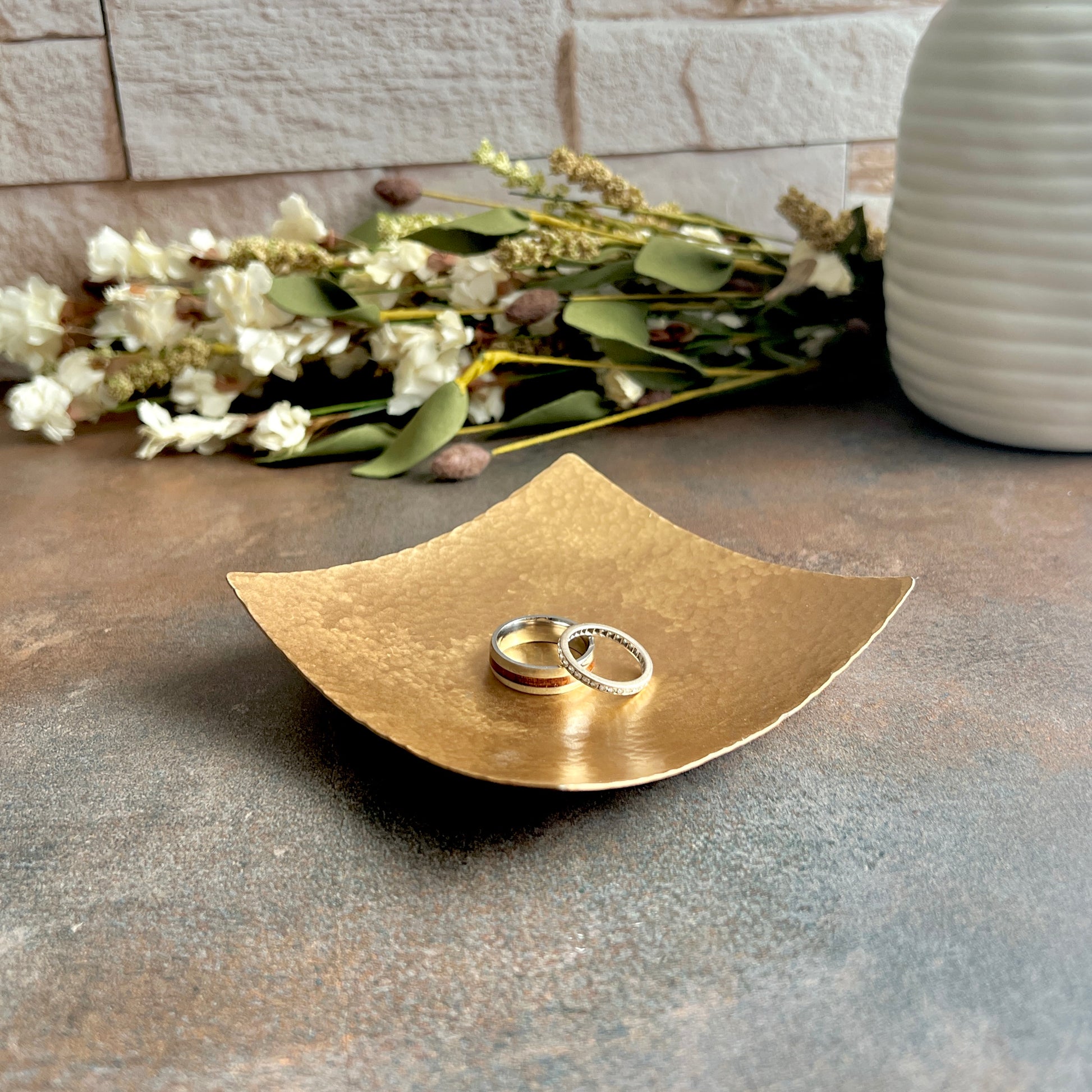 Sculptural and understated, this square bronze ring dish adds texture and elegance to any space. Each dish is shaped and hammered by hand, one at a time in our Lake Murray, South Carolina studio. Available in 3" or 4" sizes, it’s perfect for holding rings, earrings, cufflinks, or other small treasures - or standing alone as a piece of functional art.